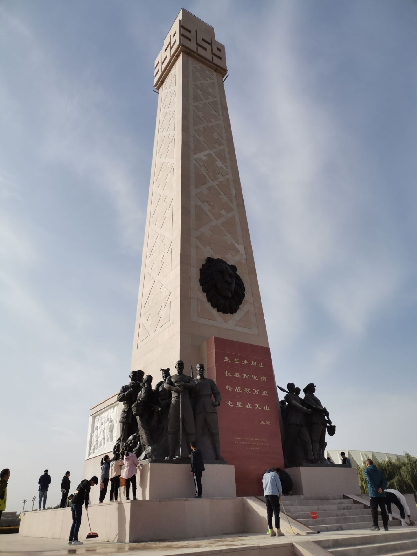 大家听完历史,怀着对三五九旅先烈们的敬仰之情,师生共同擦拭纪念碑每一个角落,在纪念碑周边洒上清水,并认真清扫。