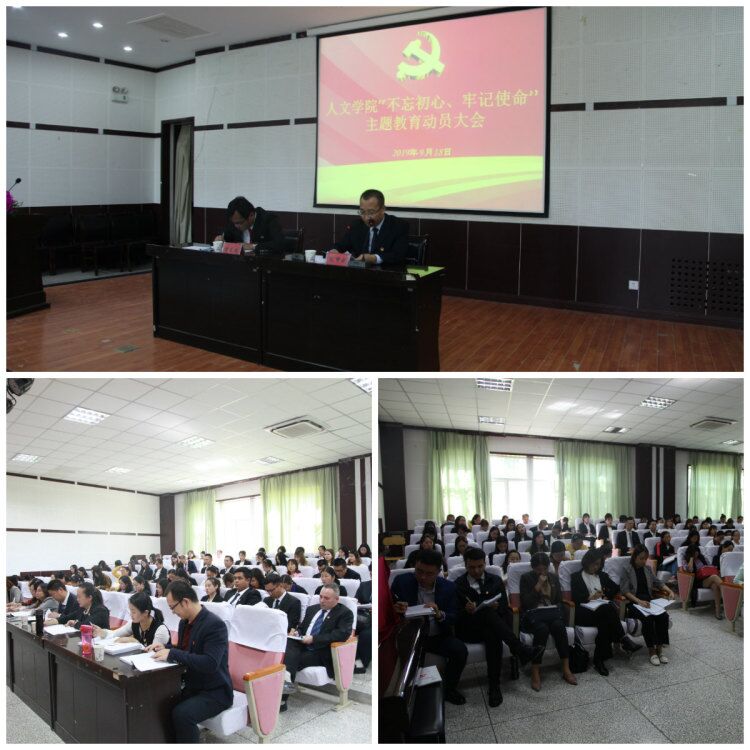 9月18日下午,人文院在行政楼B座117召开“不忘初心、牢记使命”主题教育动员部署会。主题教育第二指导小组副组长陈甲武一行,学院院长肖涛,党委副书记雷长柱,副院长秀梅,全体师生党员及民主党派代表共85人参加会议。会议由学院党委委员汪俊主持。