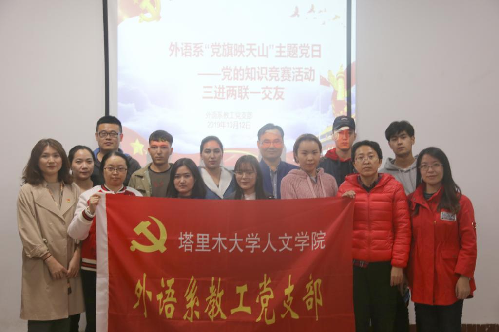 为了庆祝中华人民共和国成立70周年,扎实开展“不忘初心、牢记使命”主题教育,弘扬爱国主义精神,激发大家的爱国热情,人文学院外语系教师党员和结对子朋友10月12日晚上9:30分,在东四党团活动室开展“党旗映天山--党的知识竞赛”三进两联一交友活动。