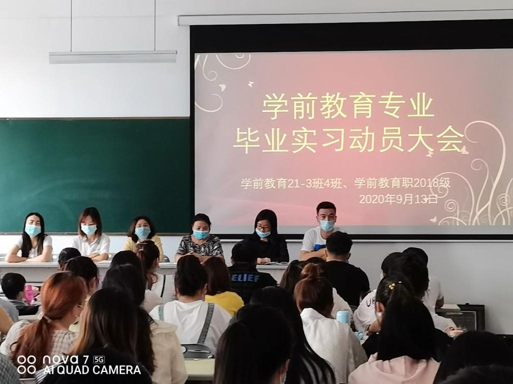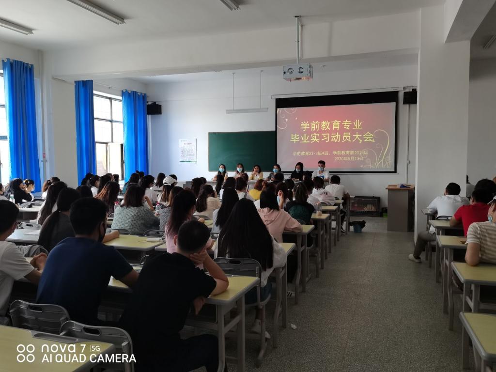 2020年9月13日下午五点,人文学院艺术与教育系在新文科楼129教室召开2021届学前教育专业毕业实习动员大会。人文学院副院长秀梅教授、教务办主任万里萍老师、专业负责人丁洁老师、学生办公室辅导员肖克来提老师、班主任吴垠老师、吴艳老师、万晶晶老师以及学前教育21-3班、学前教育21-4班、学前教育职2018级一百多余人参加会议。会议由艺术与教育系党总支副书记吴艳老师主持。