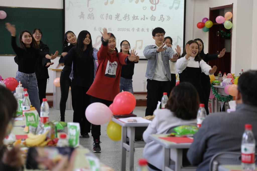 在见面会上不仅有师生之间的学术探讨,还有精彩的节目表演及师生互动小游戏。其中有新闻与传播专业的陈子韵同学带来诗朗诵《祖国啊我亲爱的祖国》,吟诵出了浩浩中华魂!其次是学前教育专业的同学们展示动人的舞步《阳光彩虹小白马》,活跃了气氛,展示青春的风采。紧接着一首富有新疆地域特色的维吾尔语歌曲《欢乐的跳吧》,带动了整场的欢乐。以及学科语文全班同学演唱《我和我的祖国》,表达了对祖国母亲的敬畏和赞美,唱出了对祖国母亲深沉的爱恋等10余个节目。
