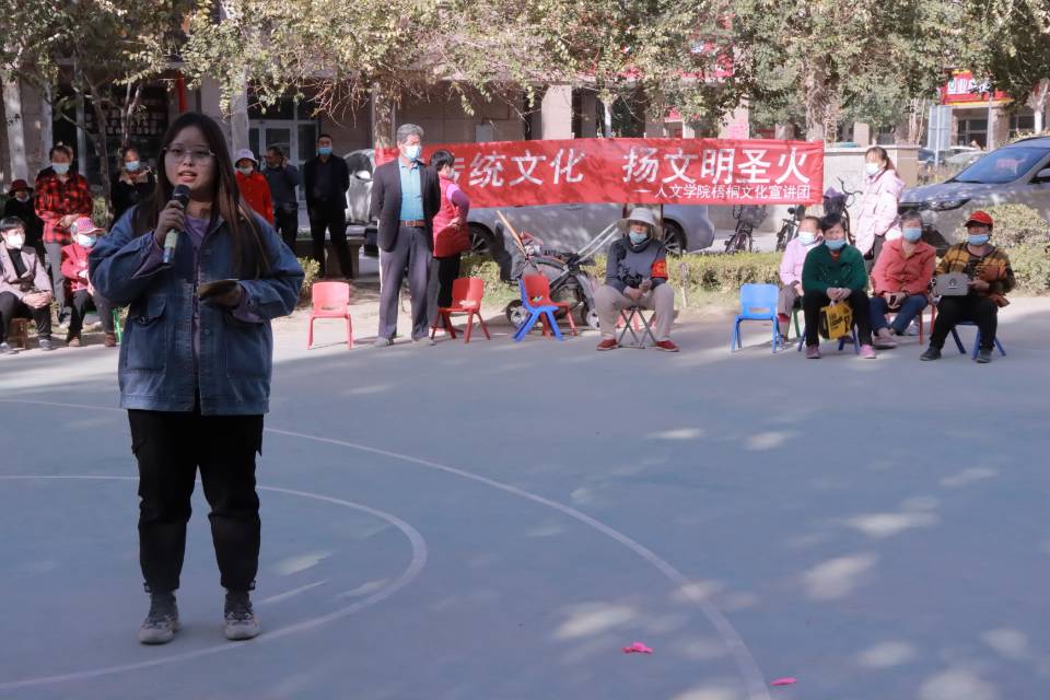 当天下午三点半,我院的志愿者来到了活动现场协助在场的社区工作人员对活动现场进行了布置。在会场布置完毕后同学们还自发的引导社区居民入场就座。在一切准备工作完毕后活动正式开始。一个个团队以自己的方式为居民们带来问候和温暖,我院的志愿者也积极参与了活动加入了社区组织的党史知识问答及创城知识问答活动,同时也以一曲红色歌曲《歌唱祖国》为在场的居民送去了人文学子的祝福。在整个活动中,志愿者们积极参与,给在场老人送去欢乐。