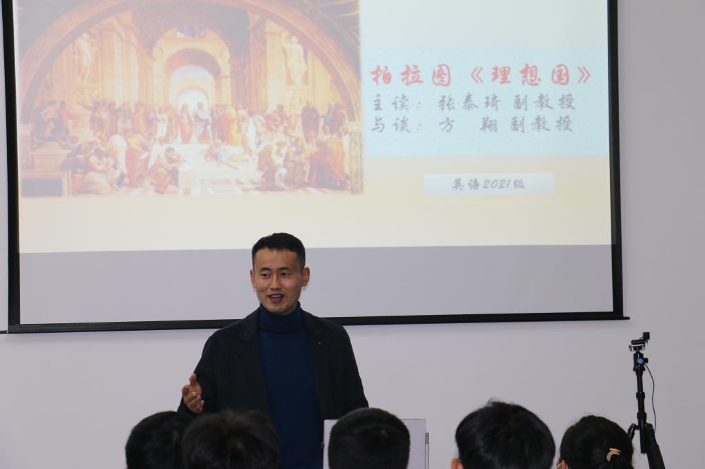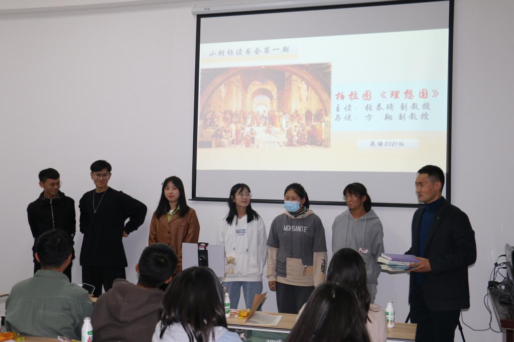 读书点亮生活。读一本好书,能启迪我们的智慧,拓宽我们的思维,净化我们的心灵,提升我们的文化素养。为培养学生阅读兴趣,营造浓郁书香班级的文化氛围,2021年10月13日晚,人文学院英语2021级在新文科楼350开展第一期“小胡杨读书会”活动。本期读书会的阅读书目为柏拉图的《理想国》,主读是人文学院张泰琦副教授,与读是人文学院方翔副教授。莅临本次活动的还有外语系教师崔有为、张学婷,传媒系教师颜敏等。英语2021级班主任郑红红、工管类2021级、英语2021级学生也热情地参与了本次活动。