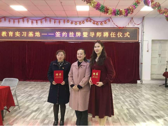 人文学院聘第一师百花幼儿园副园长杨桂芝、夏卫萍为教育硕士(学前教育)业界导师,并颁发了聘书。