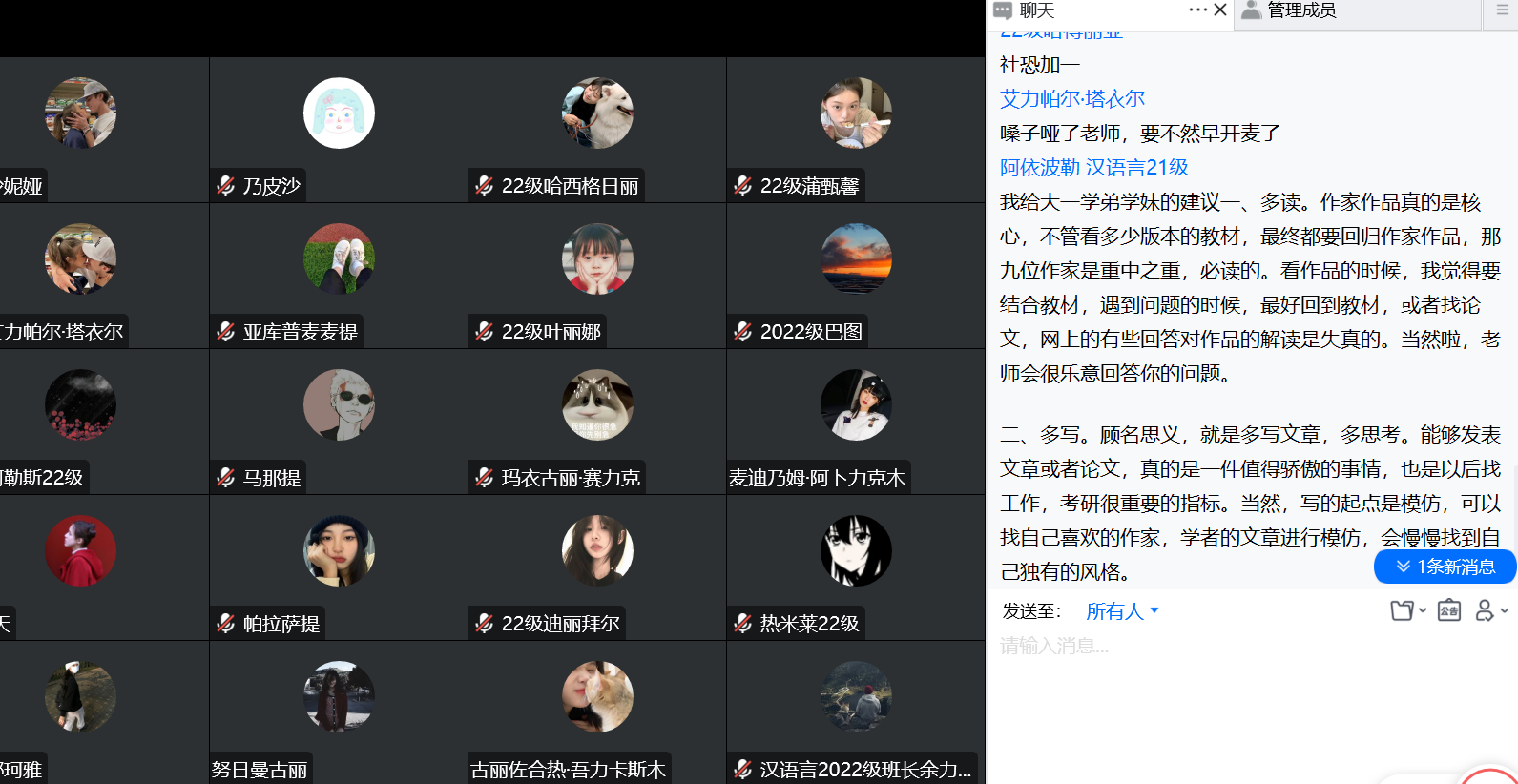 为加强汉语言专业2022级新生对专业的进一步认识,关心关爱少数民族同学疫情期间的生活、学习情况,汉语言专业于2022年12月17日晚举行“云端交流会”,活动由李雪荣老师主持,汉语言2022级、2021级共计80人参与本次活动。