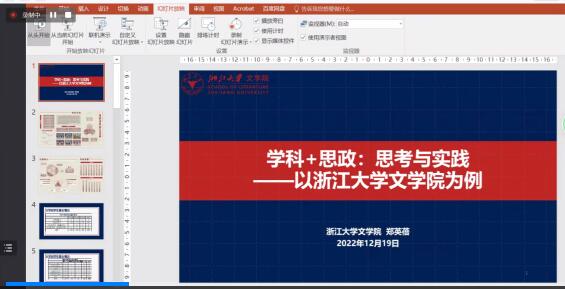 2022年12月18日晚,塔里木大学人文学院主办的“昆仑人文讲坛”系列学术讲座第八讲如期举行。本期讲座由浙江大学文学院党委副书记郑英蓓老师主讲,题目为《学科+思政:思考与实践》。讲座由塔里木大学人文学院党委副书记马彩云主持,学院师生通过腾讯会议和钉钉直播在线听取了本次讲座。