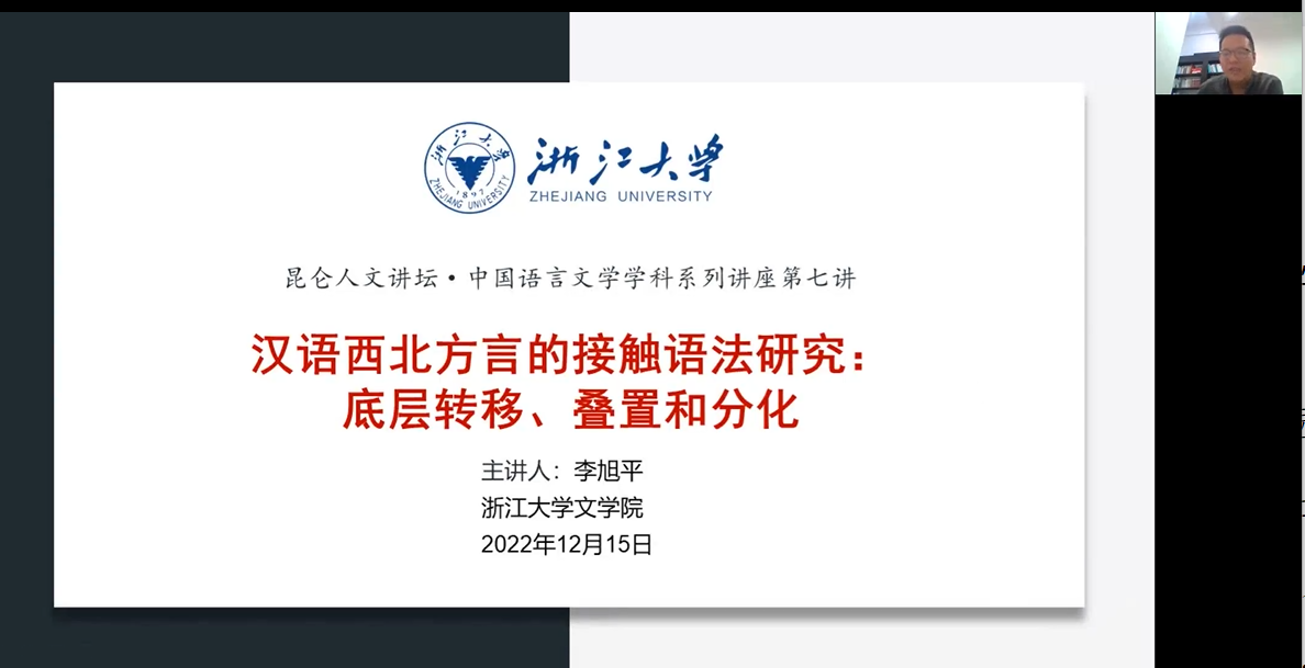 2022年12月14日晚,塔里木大学人文学院“昆仑人文讲坛”系列学术讲座第七讲顺利举行。本次讲座邀请浙江大学李旭平教授主讲《汉语西北方言的接触语法究》。此次讲座以线上会议的方式举行,人文学院中文系师生全员参加,讲座还吸引了北京大学、复旦大学、中国人民大学、北京语言文化大学等二十多所高校的师生和研究者。人文学院万素花教授担任主持。