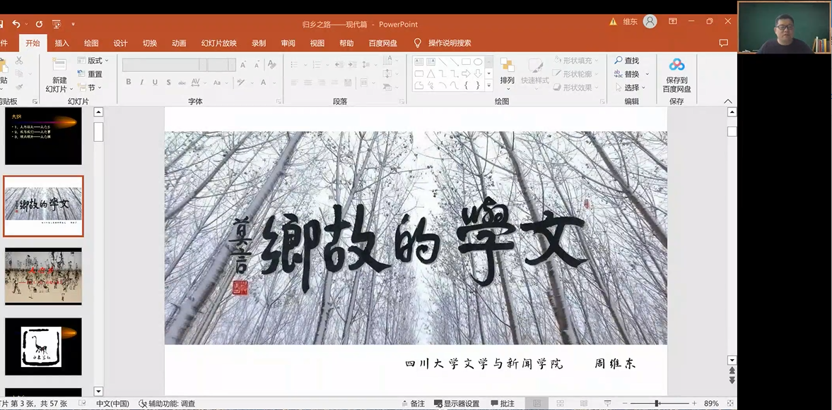 周维东教授首先指出本次讲座主题是受中央电视台拍摄的纪录片《文学的故乡》的触动而确定的,并由此提出了两个问题:“何处为乡?”“归乡之途——为何要归?”他指出故乡不仅仅只是物理空间,它还暗含着现代人孤独灵魂得以安放的精神之乡。他通过分析鲁迅的《狂人日记》《故乡》《一件小事》《社戏》、沈从文的《边城》、路遥的《人生》《平凡的世界》、刘震云的《手机》等与故乡有关的作品,聚焦作品与故乡之间的关系,从“物理之乡”“精神之乡”“人之乡”三个维度,解读作家-世界-作品之间的深层互动,阐释故乡在中国现当代文学语境下生发出的多样性意义和韵味。