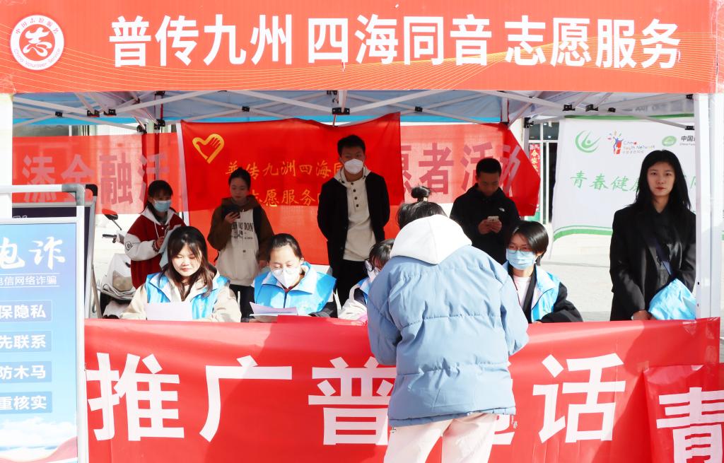 为大力营造健康、文明的语言文字氛围,以大力推广普及普通话及国家通用语言文字的实际行动喜迎党的二十大胜利召开,人文学院于2023年3月5日上午在图书馆北侧举行“普传九州,四海同音”志愿服务活动。
