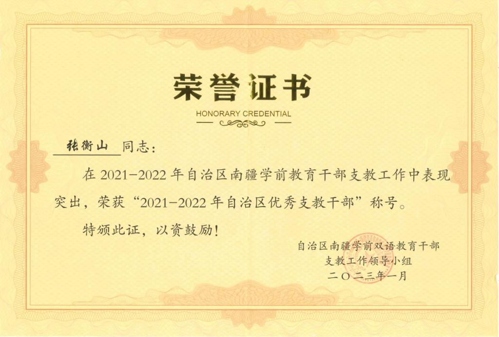 近日,我院艺术与教育系张衡山老师因在学前教育干部支教工作中表现突出,被自治区教育厅授予“2021—2022年自治区优秀支教干部”荣誉称号称号。