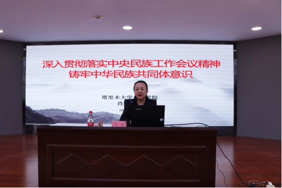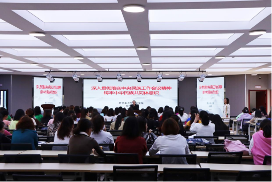 肖涛教授向与会教师的到来表示诚挚欢迎,对培训班的顺利开班表示热烈祝贺。开班仪式结束后,肖涛教授以《深入贯彻落实中央民族工作会议精神,铸牢中华民族共同体意识》为主题,从“贯彻总体国家安全观”的视阈切入,围绕中华民族共同体意识的生成逻辑,通过对重要历史节点的梳理,突出各个民族对中华民族共同体的认同,为学员解读国家民族政策、国家语言文字政策及中华民族共同体意识的内涵,并结合自身的语言学习经历,引导学员深刻认识学习推广普通话和铸牢中华民族共同体意识的重要意义。她激励学员珍惜学习机会,努力学习国家通用语言文字,不断提升自身的普通话教学水平,为铸牢中华民族共同体意识贡献力量。