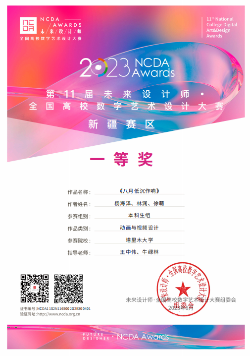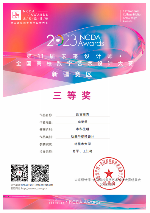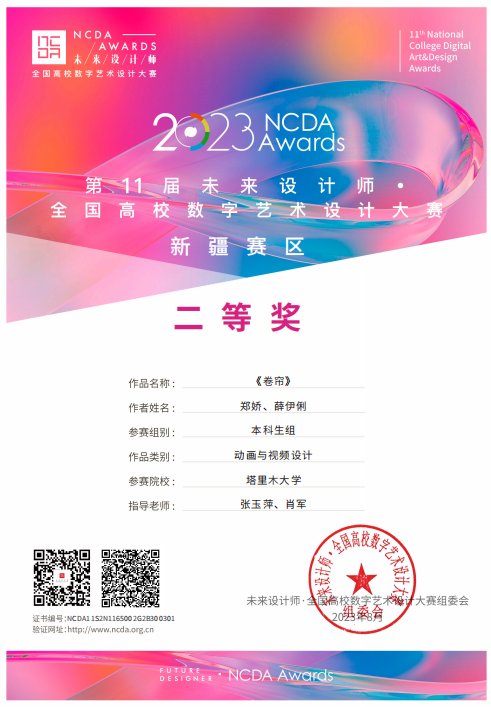 近日,塔里木大学人文学院学生在第十一届全国高校数字艺术设计大赛(NCDA)全国总决赛、新疆赛区中喜获佳绩。我校在全国总决赛中,荣获二等奖1项和三等奖1项的优异成绩;在新疆赛区中,塔里木大学参加学生总共摘得9项奖项,分别是:一等奖3项、二等奖1项和三等奖5项。