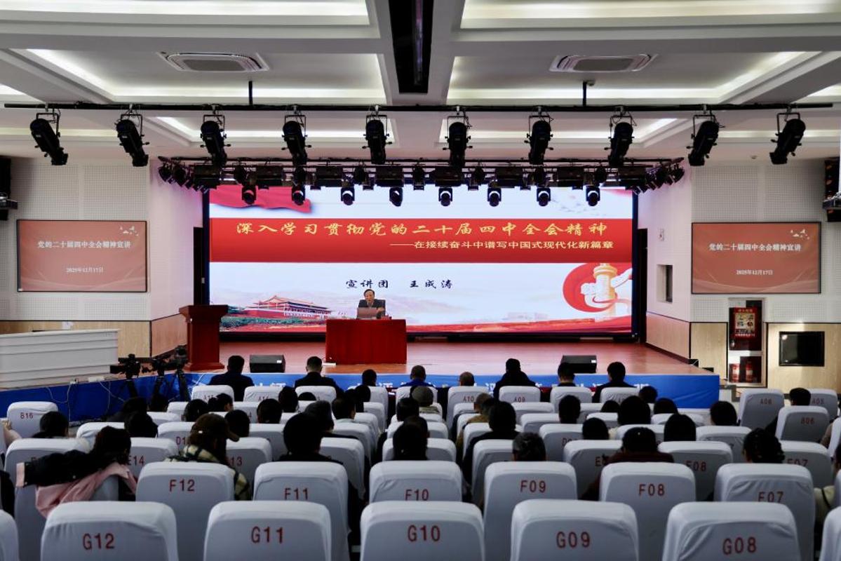 王成涛以《深入学习贯彻党的二十届四中全会精神——在接续奋斗中谱写中国式现代化新篇章》为题,从深入学习贯彻党的二十届四中全会及习近平总书记重要讲话精神,深入学习贯彻习近平总书记出席自治区成立70周年庆祝活动期间的重要讲话重要指示精神,深入学习贯彻自治区党委十届十五次全会和兵团党委八届十次全会精神,牢记嘱托感恩奋进,奋力推进兵团特点南疆特色一流大学建设这四个方面进行了深入解读和系统阐释。他强调,学习贯彻党的二十届四中全会精神是当前及未来一段时期的重大政治任务,各学院要以长远的眼光和思维看待问题,以百米冲刺的状态和行动趁势而上、厚积薄发、久久为功,为创建具有兵团特点南疆特色的一流大学而努力。