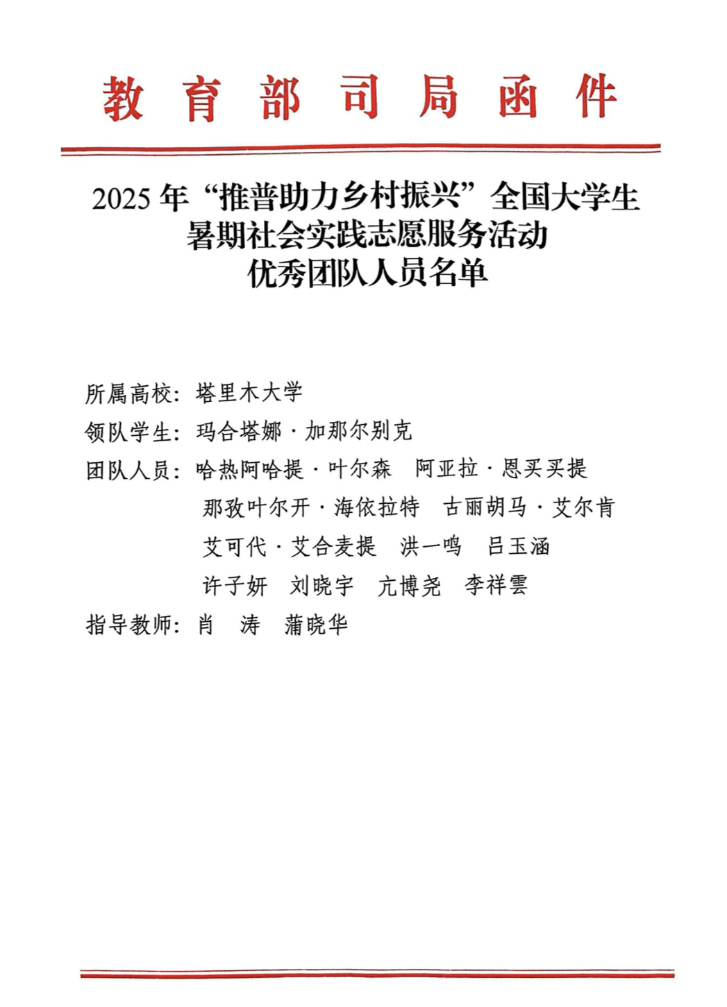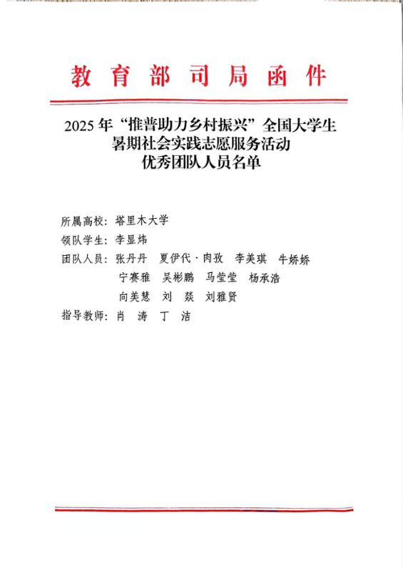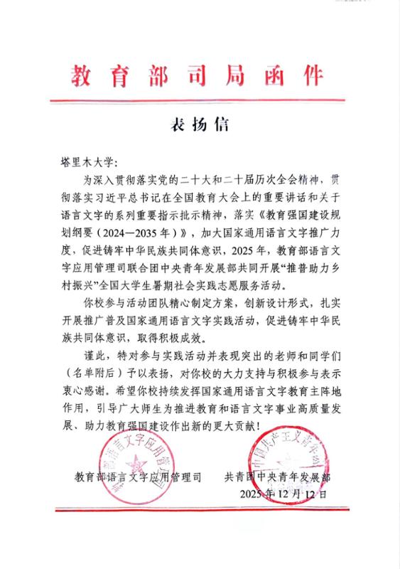 我院“语同音·心同行·业同兴”——推普助力乡村振兴实践团和“语通华夏音,情聚中国心”胡杨青年推普团两个团队紧紧围绕国家通用语言文字推广普及这一核心任务,结合当地实际需求,扎实开展形式多样、内容丰富的实践活动,取得积极成效,获表扬信一封。