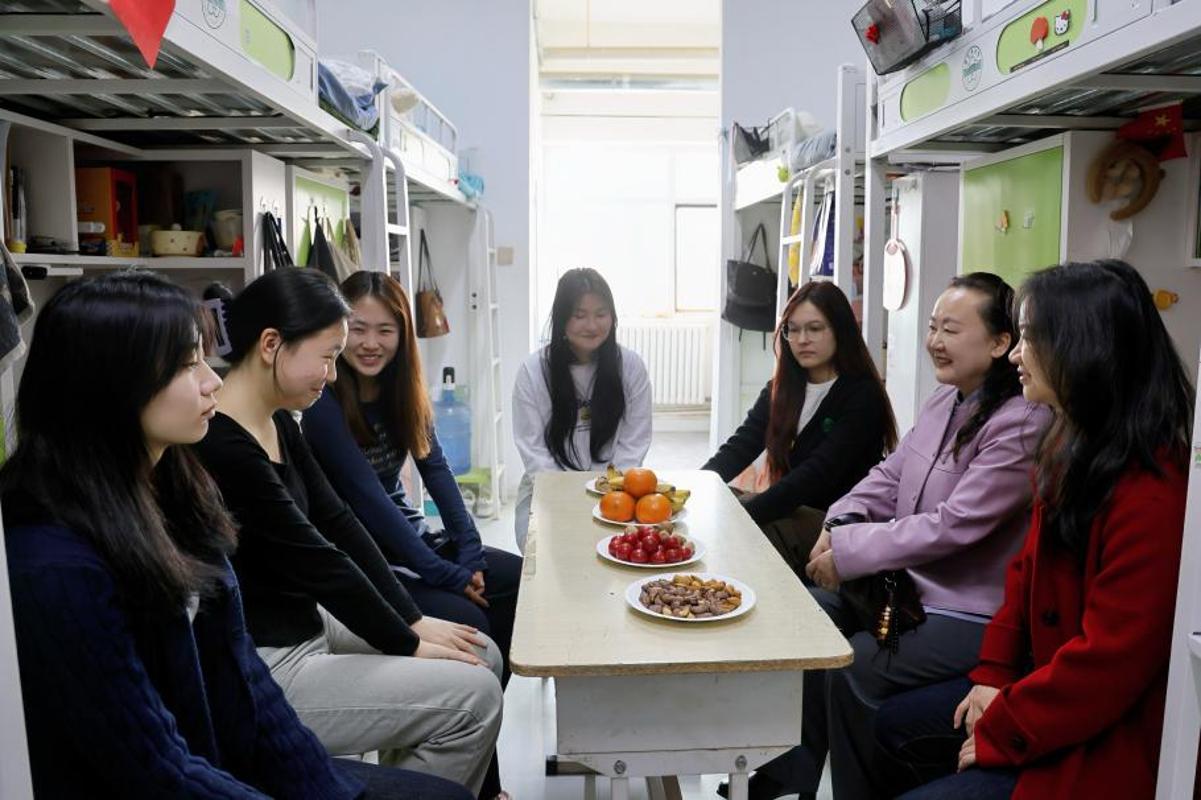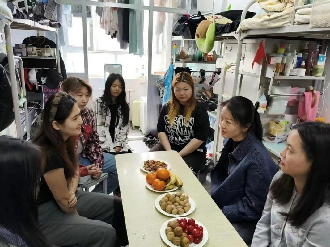 宿舍内暖意融融,桌上摆放着各色坚果与水果,节日氛围浓厚。院领导与同学们围坐畅谈,亲唠家常,细致询问大家的学习进度、生活状况和家庭情况,了解大家学习生活中的困难,勉励同学们树立自强之志,踏实钻研学业,兼顾身心健康,不负青春韶华。师生间欢声笑语、亲切交流,生动诠释了民族团结一家亲的深厚情谊。