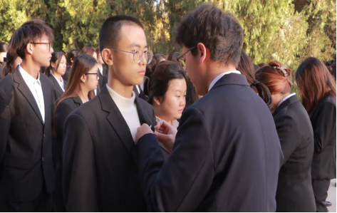 团委学生兼职副书记音克拉·切登巴勒主持本次入团仪式,首先宣布入团仪式正式开始,全体师生在王震将军像前奏唱国歌,仪式整体庄严肃穆,在阳光的照耀下显得熠熠生辉。接下来,由团委挂职副书记武昱彤老师宣读新团员名单,按照传统由老团员向新团员佩戴团徽。团徽佩戴整齐后,新团员进行入团宣誓,誓言铿锵有力,令人振奋。接着新团员游靓、老团员李诗宇代表发言,最后党员代表武昱彤对新团员提出三点希望和要求:一是努力学习,勇攀高峰;二是发挥共青团的模范带头作用;三是自觉学习党团理论知识,成为有理想有道德的新时代接班人。
