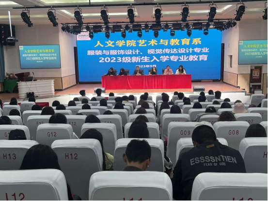 2023年9月24日,人文学院艺术与教育系主任赵会副教授在新文科楼518会议室主持召开了2023级服装与服饰设计、视觉传达设计专业新生入学教育会议。人文学院艺术与教育系书记吴艳老师,服装与服饰设计专业陈思羽老师、刘婧老师、赵辉云老师以及视觉传达设计专业陈红老师与100多名新生共同参加了本次活动。