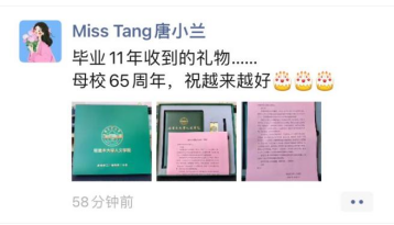 校友们在陆续接收到母校邮寄的礼物后,纷纷表示激动和感动,并在祖国各地祝福母校建立65周年生日快乐。校友们表示将继续在自己所处的领域用自强不息、求真务实的校训,敦品励学、格物致新的院训激励自己,在工作岗位上讲好塔大故事,展现人文学子风采,不忘初心,砥砺前行。
