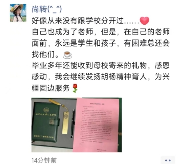 汉语言2011届毕业生买买提江·依斯拉木,现为新疆阿瓦提县第四中学教师,在收到人文学院寄出的校友礼物后激动地说:“从塔里木大学毕业已经12年了,非常感谢母校的牵挂。“艰苦奋斗,自强不息,扎根边疆,甘于奉献”的胡杨精神使我选择了教师这个职业,我将继续在平凡的岗位上为南疆教育事业贡献力量。祝愿母校:前路永辉煌,桃李艳天下;光辉历程更辉煌,人才辈出代代强!”